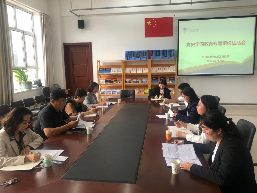8月26日上午,澳门十大信誉好的网站教工党支部在崇文楼308会议室召开党史学习教育专题组织生活会。学校党委书记王广利以普通党员身份参加了专题组织生活会。党委宣传部长刘秀兰、澳门十大信誉好的网站院长李雪峰及全体党员参加会议。