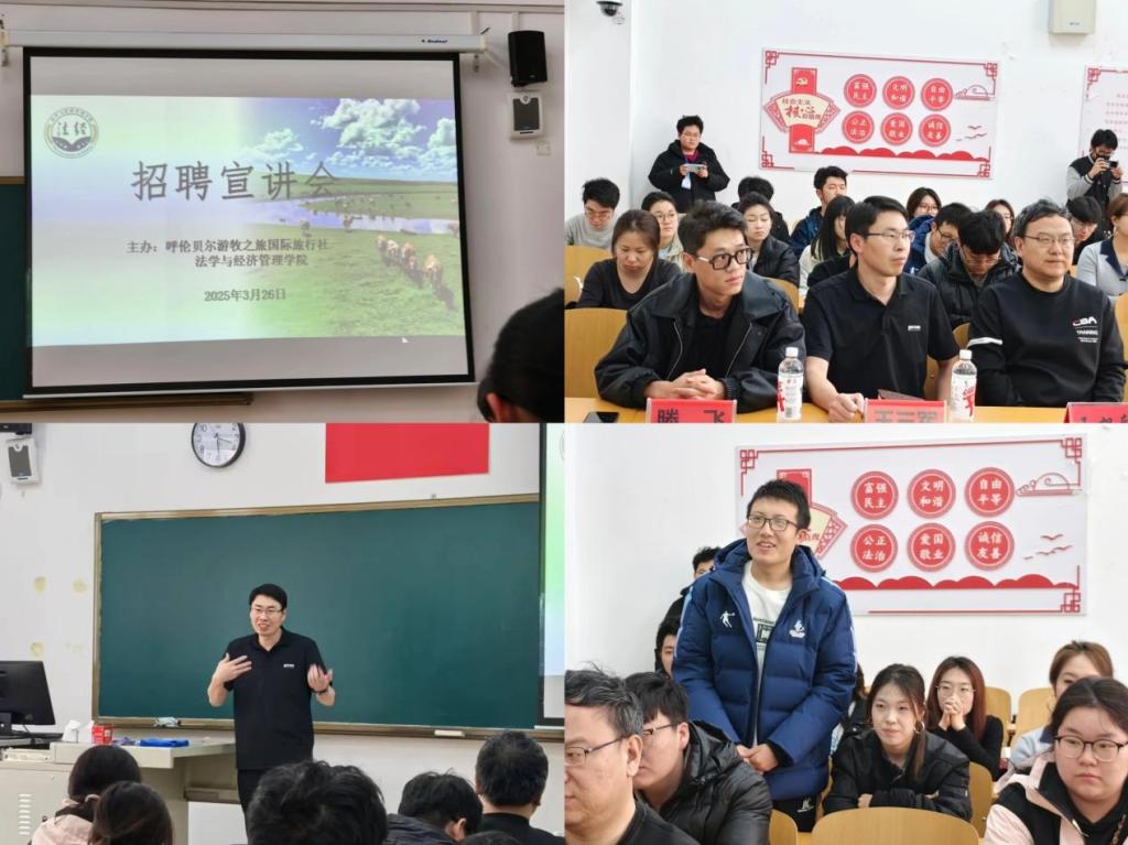 为进一步拓宽毕业生就业渠道,搭建校企合作平台,3月26日下午,澳门十大信誉好的网站与呼伦贝尔游牧之旅国际旅行社有限公司在崇文楼A座413联合举办专场招聘宣讲会。呼伦贝尔游牧之旅国际旅行社有限公司副总经理王三军、直播团队负责人滕飞,团学办主任王旭轩、辅导员高郁方及各年级学生代表参加本次活动。
