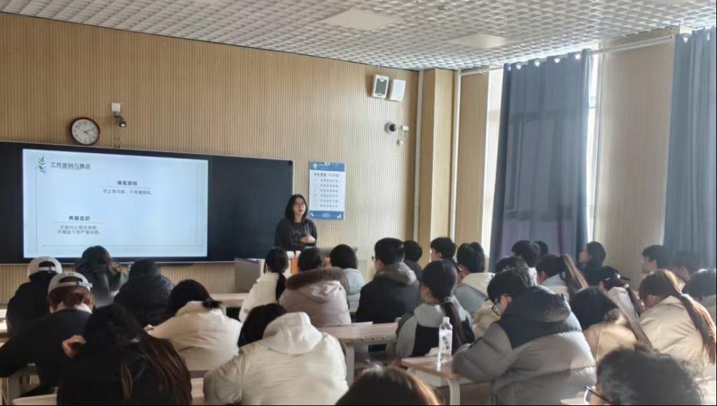 本次培训以“心晴同行,春煦花开”为主题,紧扣春季心理危机高发期的季节性特点,内容涵盖角色认知、信号识别、沟通技巧及上报流程四大核心模块。培训中,主讲人丁琳对各班级心理委员的“观察员、支持者、宣传员、桥梁纽带”四大角色进行了解读,并严肃重申了保密原则与工作界限,明确要求全体人员在工作中严守底线,确保朋辈互助工作的科学性与规范性。在危机识别与预警环节,丁琳结合具体案例,深入剖析了需重点关注的预警信号,为参训人员提供了清晰的观测范式。随后,她系统讲解了《班级心理晴雨表》的规范填写要求与危机上报流程,旨在畅通信息报送渠道,确保危机事件能够被早发现、早报告、早干预。会议最后,她特别强调了朋辈互助者的自我关怀,倡导大家“把专业的事交给专业的人,把温暖的事交给温暖的你”,努力在助人过程中实现自助与成长。