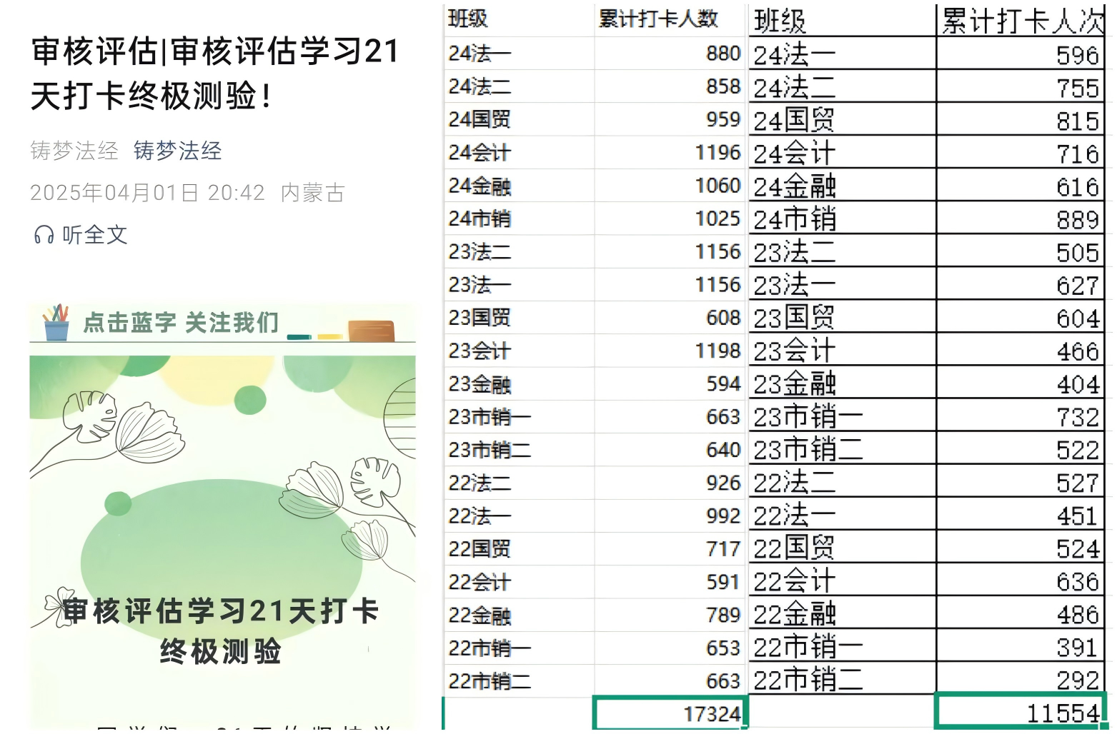 活动主要包括“21天学习打卡挑战”和“学风监督员”两项。一是通过线上小程序坚持每日专业课学习打卡,学生们积极参与,坚持分享学习心得、学习笔记、学习照片等,累计打卡次11554人次;同时,依托“铸梦法经”微信公众平台,每日推送“评估知识胶囊”,师生共同学习评估知识,累计打卡次数达到17324次。二是推行学风监督员制度,探索建立教学联动——党员参与——监督反馈机制,选派党员教师、优秀学生干部进行监督检查,与任课教师形成有效合力,减少了迟到、早退、旷课等不良现象,学习氛围日益浓厚。