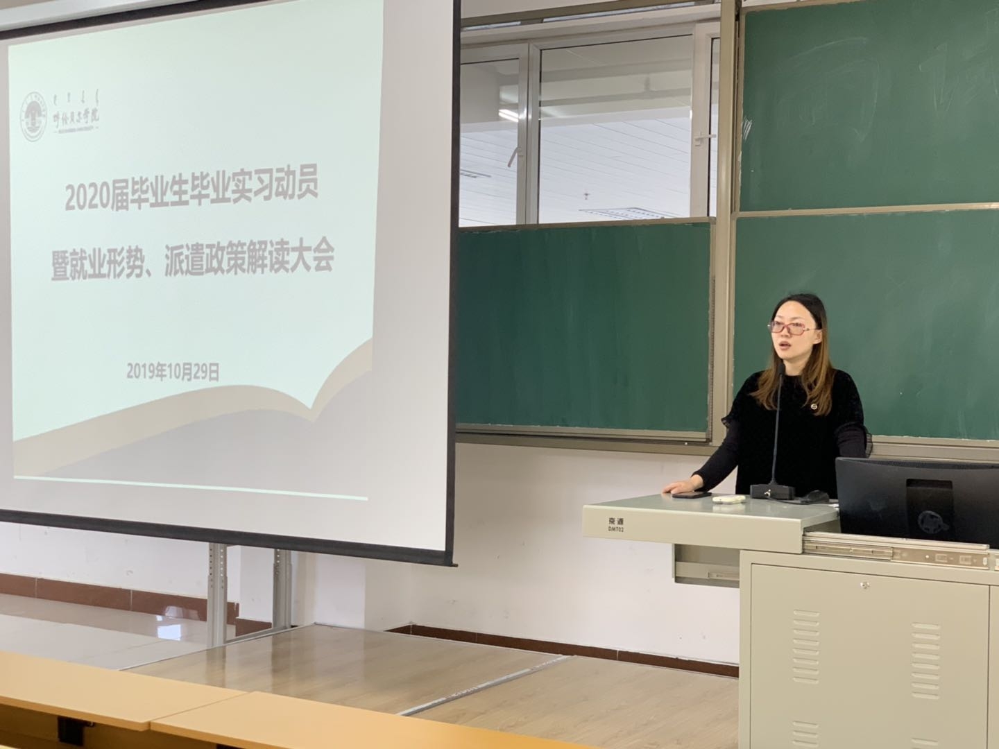 1029日下午,在崇文楼B401召开2020届毕业生毕业实习动员暨就业形势、派遣政策解读大会。出席本次动员大会的有澳门十大信誉好的网站副院长刘启云、学工办主任张迪及2016级全体毕业生。